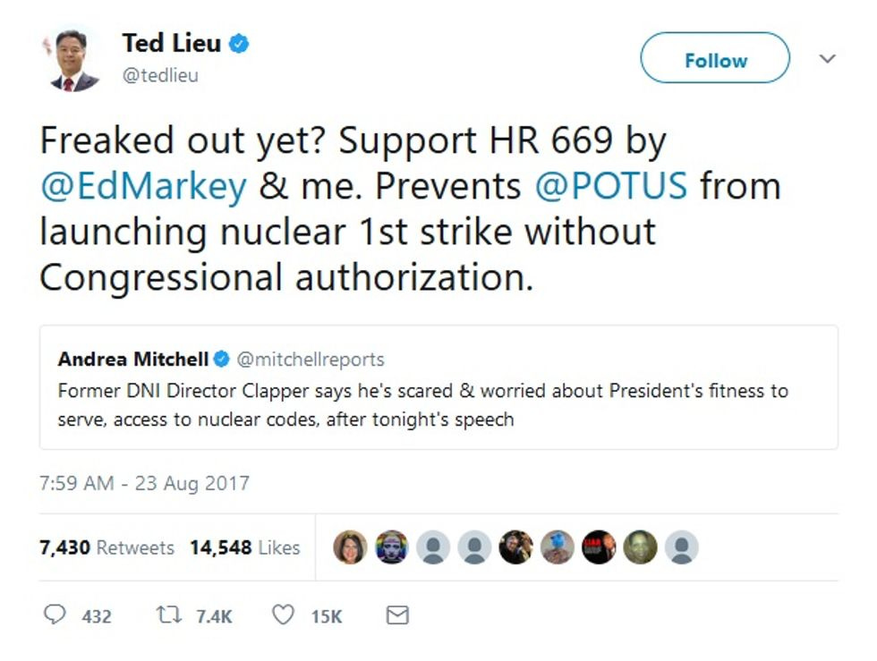 California Democratic congressman Ted Lieu, who along with Sen. Ed Markey of Massachusetts is co-sponsoring a bill that would require Congress to declare war before a president could launch a nuclear first strike, Tweeted in response to Clapper's comments that maybe this would be a good time to have a good talk about nuclear command and control: