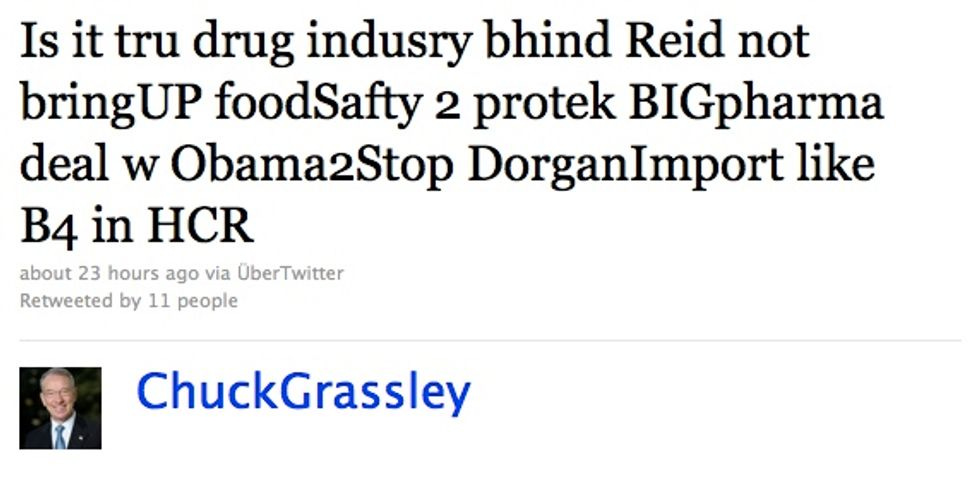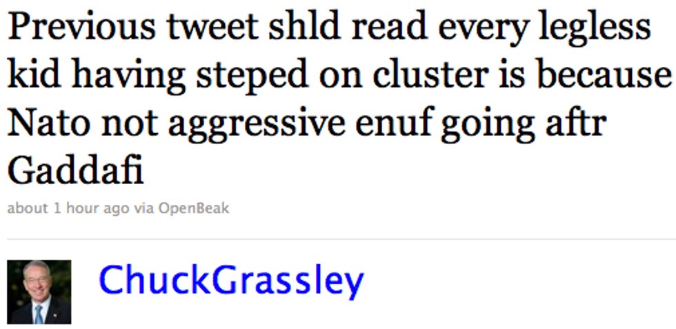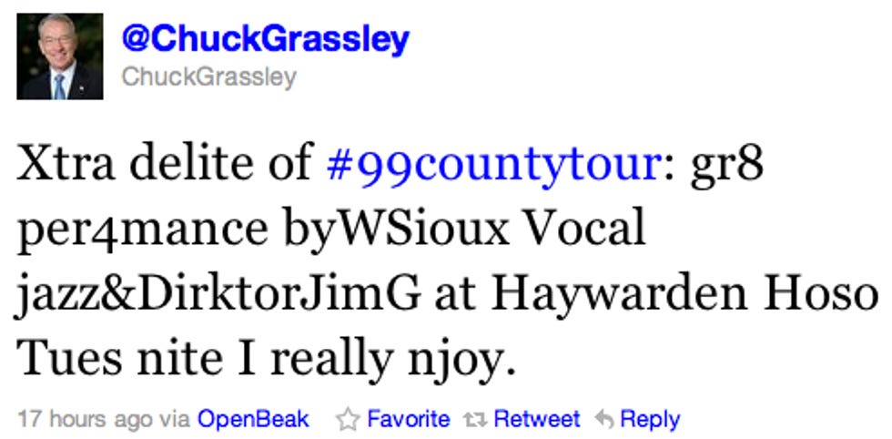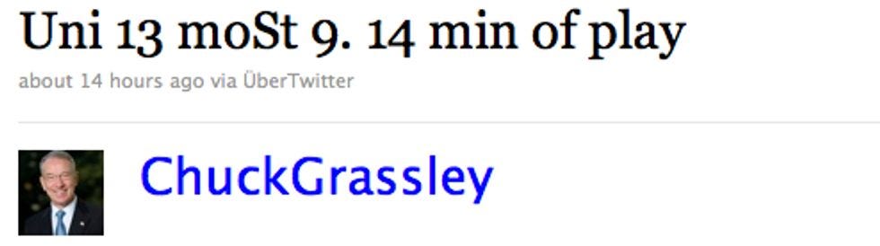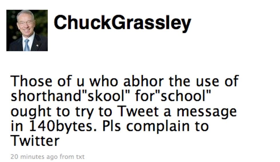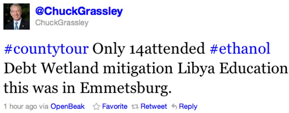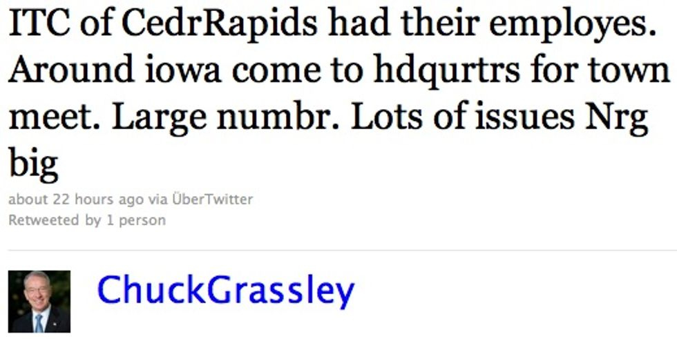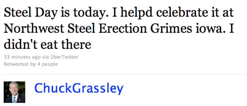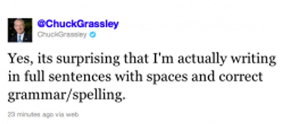 Incredibly, that piece from The Hill about Grassley's Twitdiction mentioned a Grassley Tweet which somehow escaped Yr Wonkette's devoted attention: