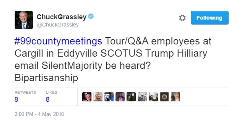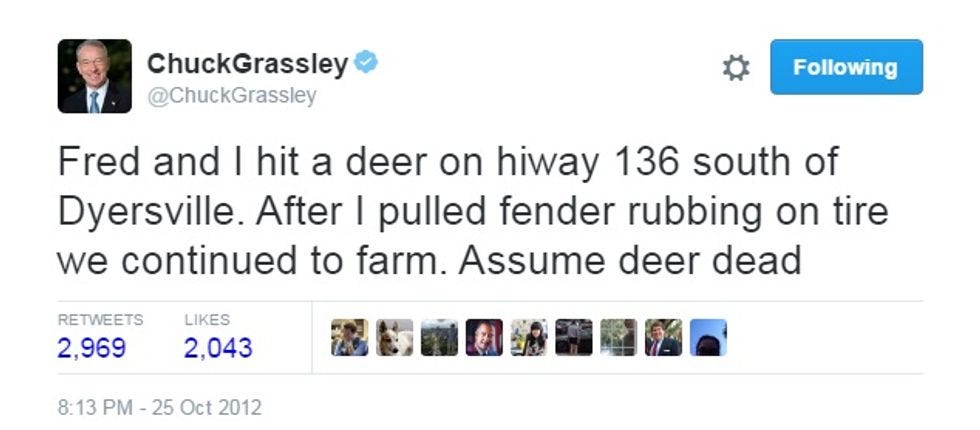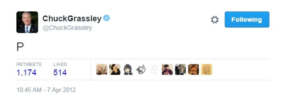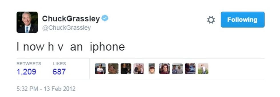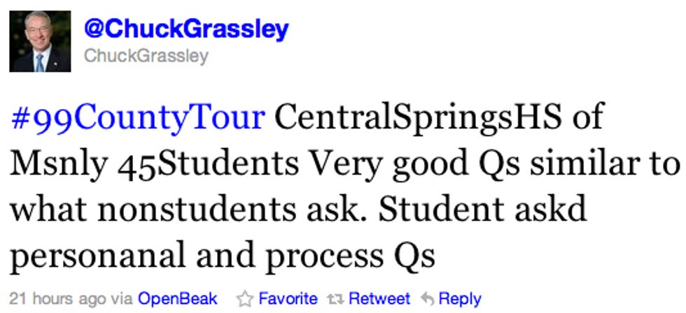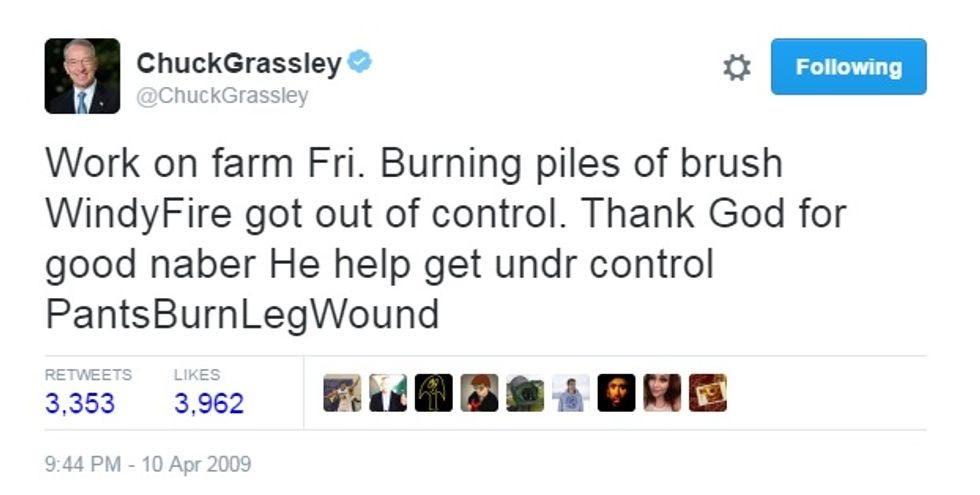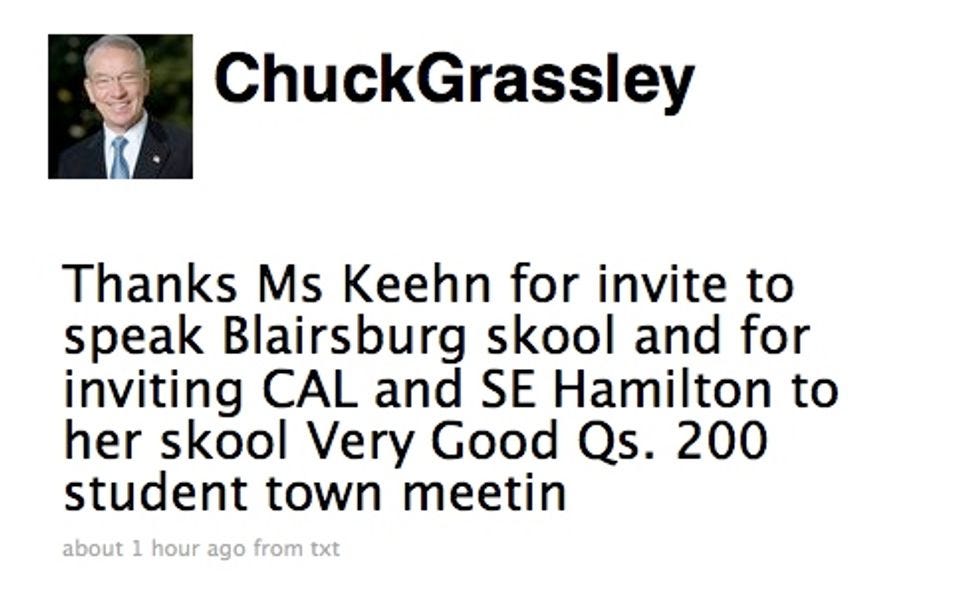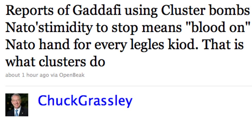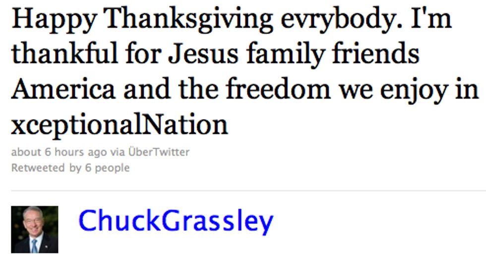 Incredibly, that piece from The Hill about Grassley's Twitdiction mentioned a Grassley Tweet which somehow escaped Yr Wonkette's devoted attention: