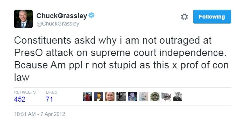 Grassley's tweets remained as aggressive ever; in April 2012, he gave President Obama a good dressing down for having the temerity to say he rather hoped the Supreme Court would uphold the ACA. Horrified conservatives could not believe the POTUS would try to unconstitutionally influence the SCOTUS by barging in with his unsolicited opinion, and Grassley made it clear this so-called constitutional expert knew NOTHING about the Constitution: