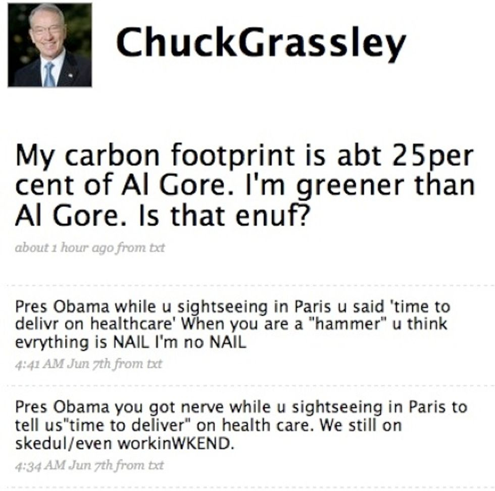Grassley somehow managed to make a cornball 2010 campaign adabout his Twitter problem, or prowess, or whatever the hell he thought it was. (It was acry for help,is what it was.)