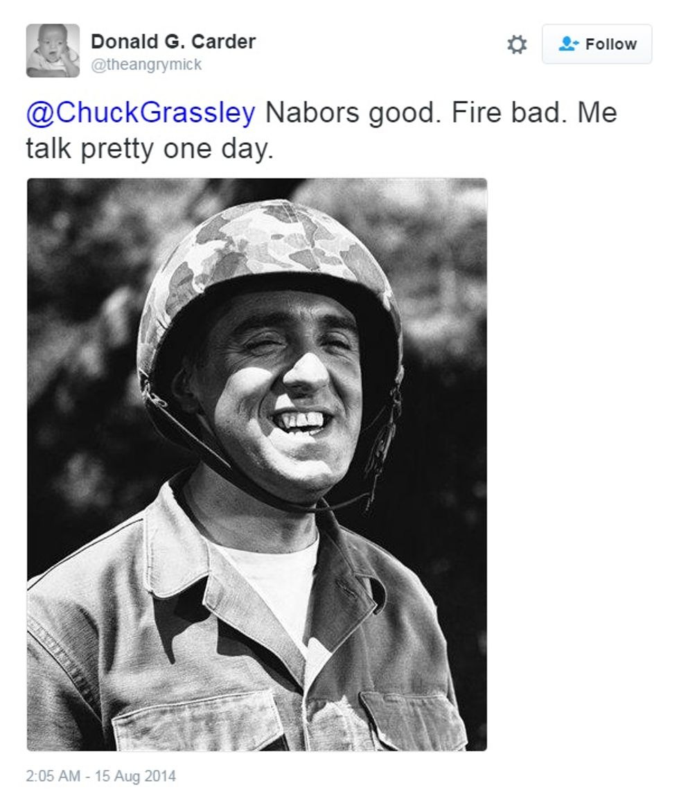 Grassley remains active on Twitter, even though Barry Bamz Obama is no longer his BFF like he was back when Grassley was not doing shit on the ACA. And while his tweets are still gibberish, they feel a bit like the last seasons of Northern Exposure or The X-Files: It's familiar, but that shark got jumped a while back: