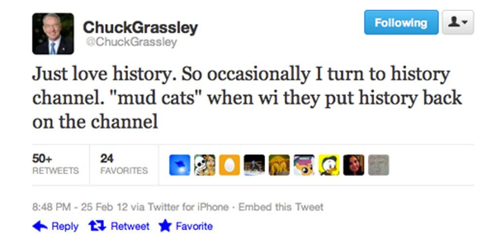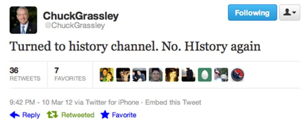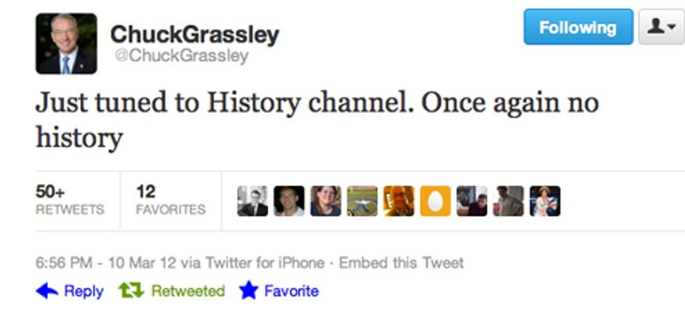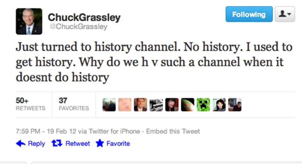 Armed with this new tool, Grassley began tweeting like the same old tool as ever. He noticed, about six years after everyone else, that there was a distinct paucity of history on the History Channel. Grandpa Cornpants was not pleased:
