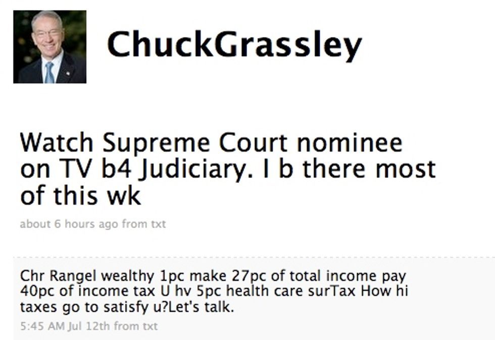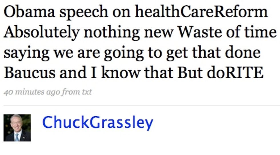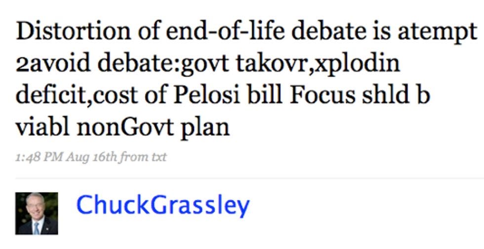 Not all of Grassley's tweets were trivial, however. While busily pretending to help with writing the Affordable Care Act (but really just obstructing it all the way), he teetered and tweetered between seeming to say "death panels" were real and denying he'd said any such thing. Besides, the whole "death boards" thing was a distraction from the evil Democratic plan for a GOVERNMENT TAKEOVER of healthcare: