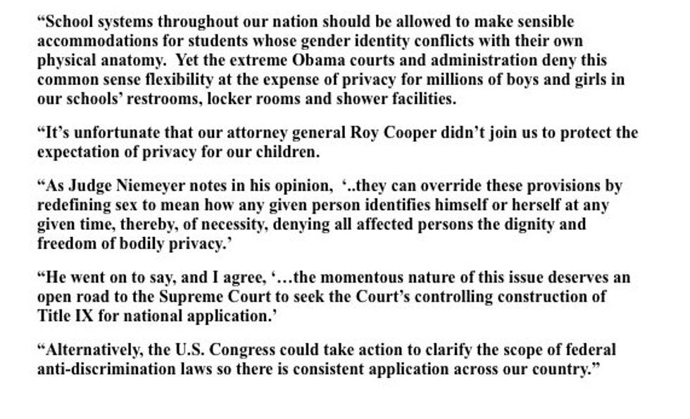 In case you'd rather pick lint out of your dad's navel than read that driveling bullshit, the funny part is where McCrory weeps and bangs his hick boobies together about how "the extreme Obama courts" are imposing this on everybody.