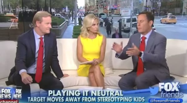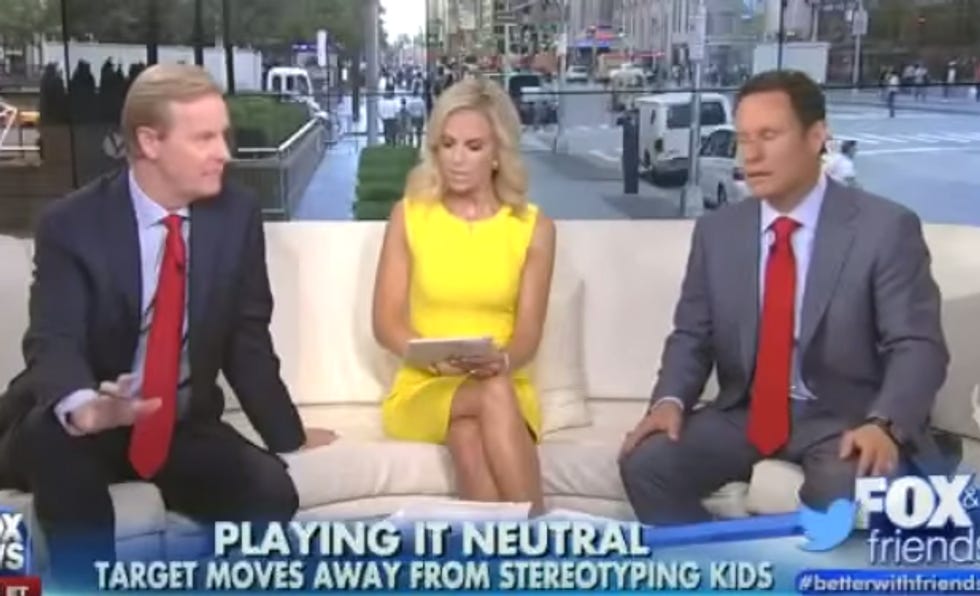 It is a day, which means there is a news story that is evidence of the PC police gone whackadoodly, and the adult daycare couch of "Fox & Friends" is exhibiting signs of confusion. The culprit: Target. How is Target making the Fox hosts confused and sad and scared? By removing gender-based labeling on children's toys.