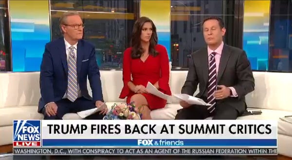 Usually the next morning's "Fox & Friends" is like Carlson and Hannity's afterbirth, but Tuesday morning was a little bit different! For some reason, Steve Doocy and Brian Kilmeade and Abby Huntsman were not 100% pleased with Dear Leader's behavior in Helsinki! So they put on their Joe Scarborough and Mika Brzezinski masks and did their best impression of a more dumber version of "Morning Joe," and oh my god it was SO WEIRD. Like, they would be outraged for a second, but then they would immediately compliment him and reassure him that he is a Very Good Boy who won that presidential election fair and square.