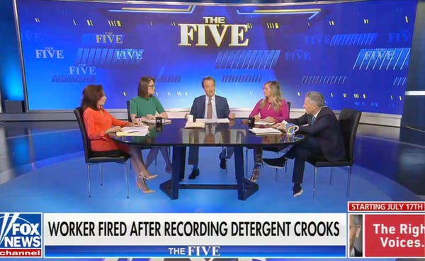 This week, the gang at Fox's The Five discussed a recent incident in which a supermarket worker was fired for filming shoplifters stealing a bunch of laundry detergent. Co-host Greg Gutfield suggested that workers should be armed and came up with a bizarre idea for stores to hire people to stand outside of their stores and steal stolen items back from the shoplifters — and even recommends it as an ideal after school job.