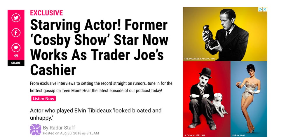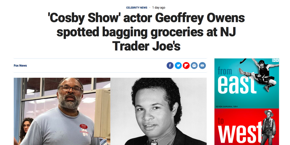 Fox News, however, being Fox News, kicked off this holiday weekend with a particularly shitty article about how Geoffrey Owens, who played Elvin on The Cosby Show , was discovered to be working at a Trader Joe's in New Jersey. He was "spotted" by a woman named Karma Lawrence, who took a picture of him and then, for whatever reason, decided to go screaming from the rooftops that a guy from The Cosby Show... has a job .