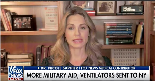 Fox News "medical expert" and expert terrible person, Dr. Nicole Saphier, phoned her “Fox & Friends" Sunday from the comfort of her self-quarantined home studio where she has a copy of Gray's Anatomy prominently displayed on a shelf because she's apparently a doctor. Dr. Saphier suggested a couple months ago that universal health care makes everyone less healthy because they can see doctors whenever they want, which as we all know is so much fun you just can't stand it. Now she's arguing that medical care turns sick people into leeches, sucking up oxygen from ventilators as if they're suffering from some insidious upper respiratory disease.