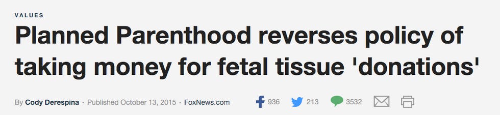 That's some real fine fair and balanced reporting, don't you think? Granted, Planned Parenthood did not actually use the phrase "aborted baby parts" in its announcement that it will now absorb the entire cost of extracting and shipping donated fetal tissue to medical research labs, even though it is legally entitled to be reimbursed by labs for such expenses. But then, Fox doesn't really believe those BABY PARTS are really "donated" anyway, at least not according to the headline for its story, filed under "values":