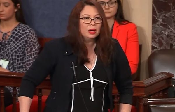 You see, Tammy Duckworth has no legs. She lost them in the Iraq War, where she served as a US Army helicopter pilot. Iraqi insurgents shot down her helicopter in 2004 with a rocket-propelled grenade. She lost both limbs in the attack, as well as some mobility in her right arm. She requested a medical waiver so she could continue to serve in the Illinois National Guard for another decade. Her injuries apparently weren't as severe as bone spurs.
