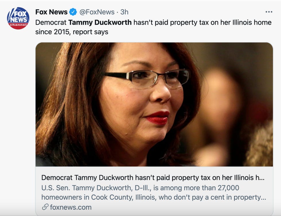 Fox News publishedan exposé Sunday on Democratic Senator Tammy Duckworth from Illinois that revealed she's paid no property taxes on her Chicago home since 2015.