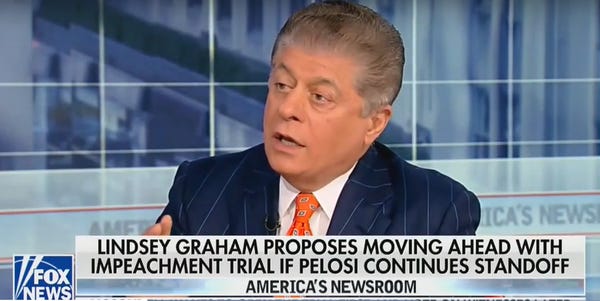 Napolitano also had some things to say about how blah blah, he understands Lindsey Graham's frustration, blah blah, Senate shouldn't do anything about the impeachment until Nancy Pelosi decides to GIVE IT, blah blah blah. And he said that yes, the Senate can totally change its rules, just like Lindsey Graham said, and decide to pre-emptively throw the impeachment in the trash if they want, without even receiving the articles from the House. (He did not, however, mention the part Wonkette mentioned about how difficult it would be for Mitch McConnell to get the votes to do such a thing.)