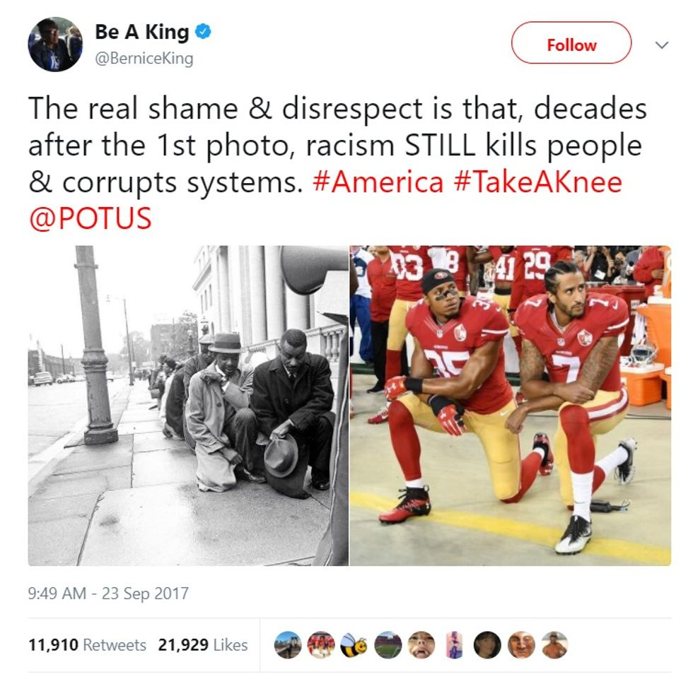 King's youngest daughter Bernice seems to have the crazy idea he'd be kneeling for civil rights today, even though she doesn't even work for the New Yorker: