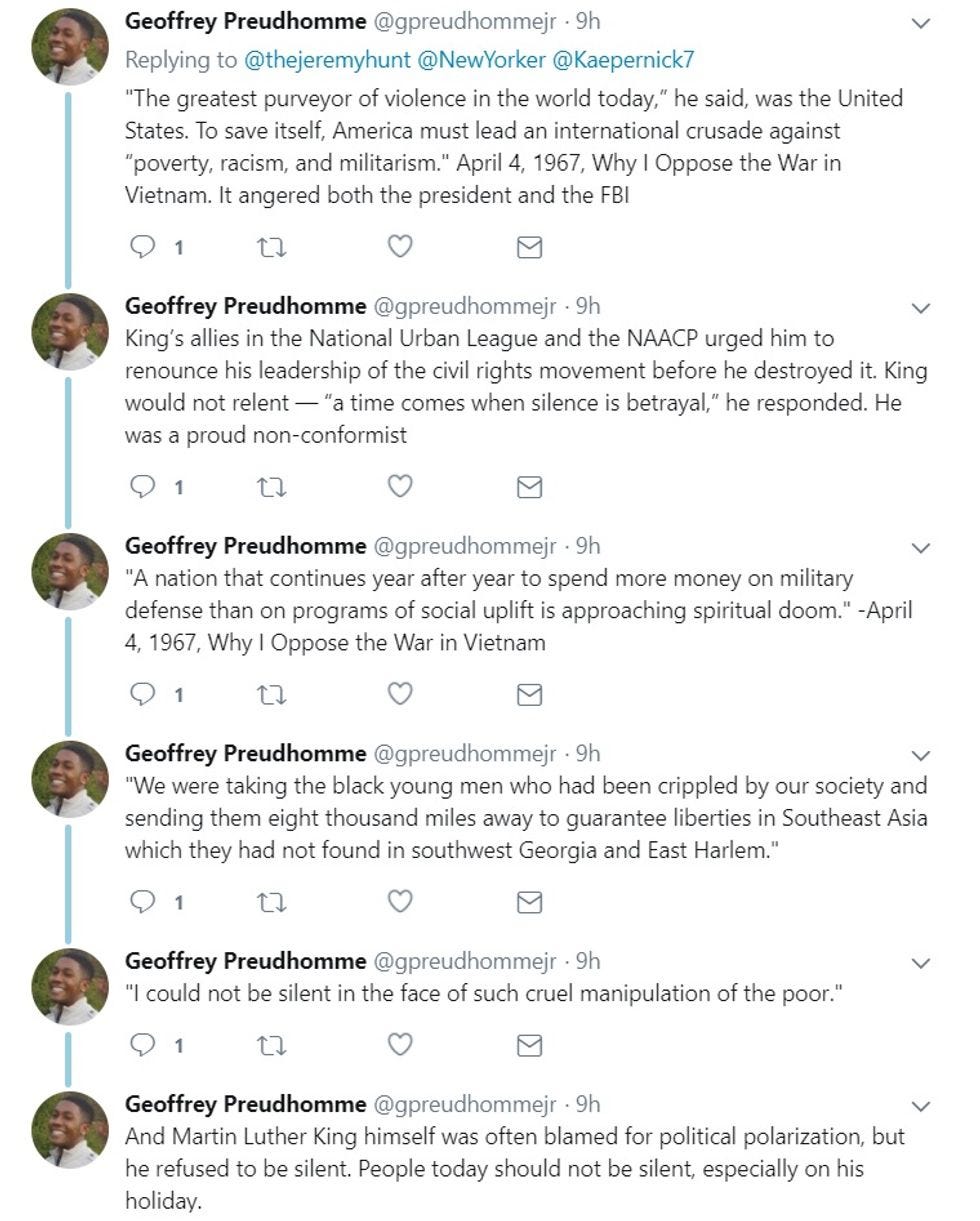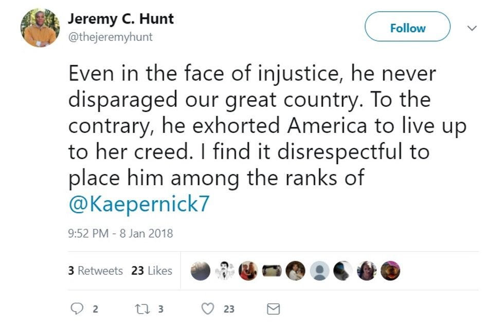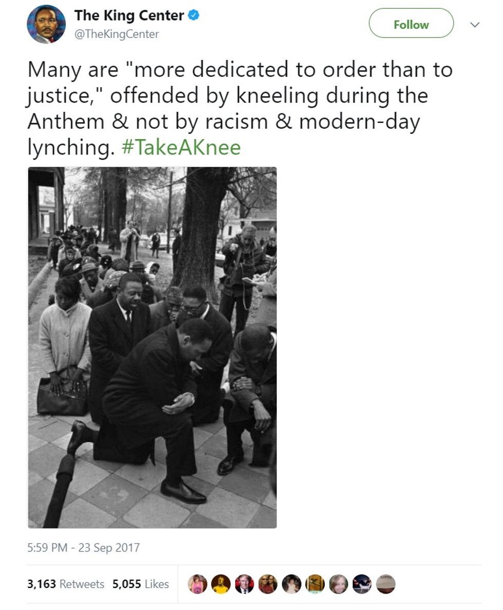 Worth noting: a nice white lady replied, "dont compare king to flag and america haters...King bent the knee in prayer!!! NOT during national anthem!!!!" Wouldn't want some radical black lady disrespecting MLK like that.
