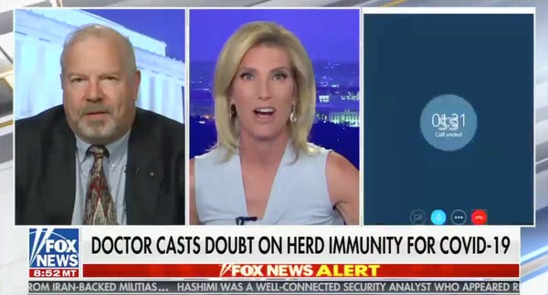 The good doctor fails to make clear to Ingraham's gullible viewers that "herd immunity" works best when there's a vaccine.If you don't have one, letting the disease spread unchecked isn't really "herd immunity." It's genocide.