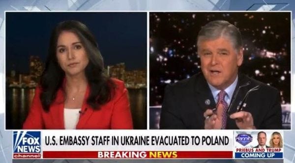 Here is Gabbard telling Sean Hannity that "Putin has made very clear all along" that this is about Russia's security. She just really needs you to know what Dear Leader Putin has been making clear all along. In response, Hannity was like OK yes but Putin also says Ukraine isn't a real country and has been saying he's going to do this for a really long freaking time. Gabbard responded, "I want to stay focused on the security component."