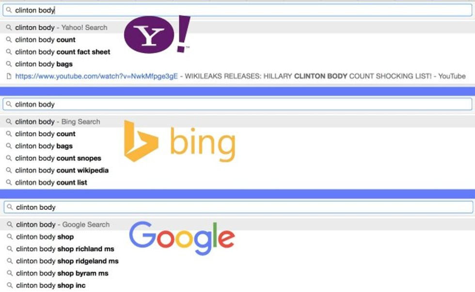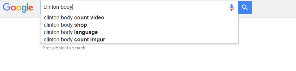 If a user types in "Clinton body," they get car repair shop results, instead of a story that talks about a list of people tied to the Clintons who have died under mysterious circumstances ...