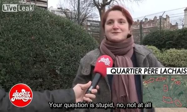The New York Times notes that the entire myth seems to have started with a Russian TV report about a 1996 French Interior Ministry list of "Sensitive Urban Zones" -- basically, poor areas targeted for economic redevelopment -- which in a 2006 post by American anti-Muslim blogger Daniel Pipes got transformed into "proof" that there are parts of France "that the French state does not fully control." The wingnuttosphere did its usual job of repetition and exaggeration, and soon the idea of "no-go zones" was firmly established in the rightwing imagination -- even Wonkette's old frenemy Victoria Jackson firmly believes they exist, and she suspects they exist in the USA, too, like maybe in "Dearborne, MI" [sic]. She also links to a video by unapologetically fascist anti-Muslim group "Britain First," which she apparently approves of because it's labeled a "Christian Patrol" driving through "Muslim Occupied East London."