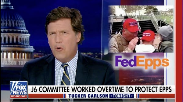 The next day, Epps was present when the barricades were breached at the Capitol, although he claims he was trying to calm the situation. In his telling, when the FBI posted his photograph as a person of interest after the attack, he immediately contacted the agency and cleared the whole thing up. But then in October of 2021, in his Patriot Purge special, Tucker Carlson started flogging a storyline that Epps was a federal agent provocateur, riling up the poor, innocent Trump supporters in an effort to discredit their movement. And he kept flogging it more or less right up until he, Carlson, was fired in April of 2023.