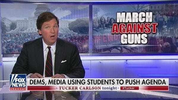 By Monday, Carlson was back, explaining that all those stupid screaming children aren't good for America, or for journamalism. No, not the ones screaming while their school was being shot up, the shrill little America-haters at the march. Enjoy his perfectly fair characterization of the march: