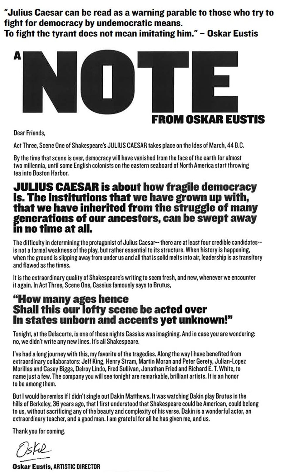 A brief clip of remarks from Oskar Eustis before the show begins. Happy opening, JULIUS CAESAR. pic.twitter.com/84zx8KgvxN