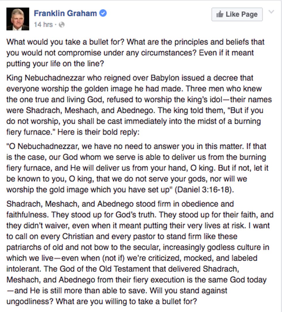 Last night, Franklin Graham, scion of Billy Graham, asked all his Facebook followers a very serious question: " What would you take a bullet for? "