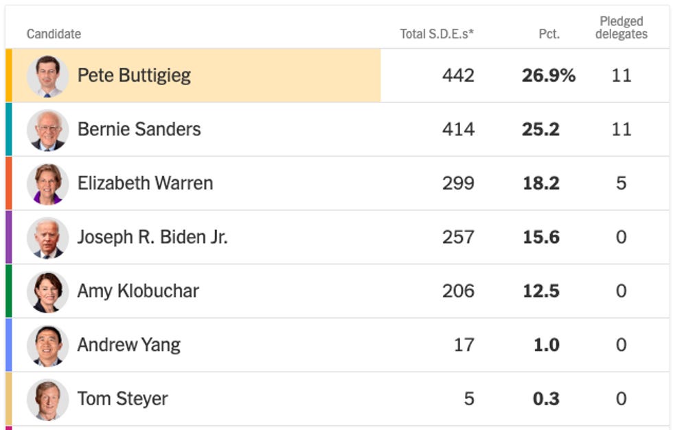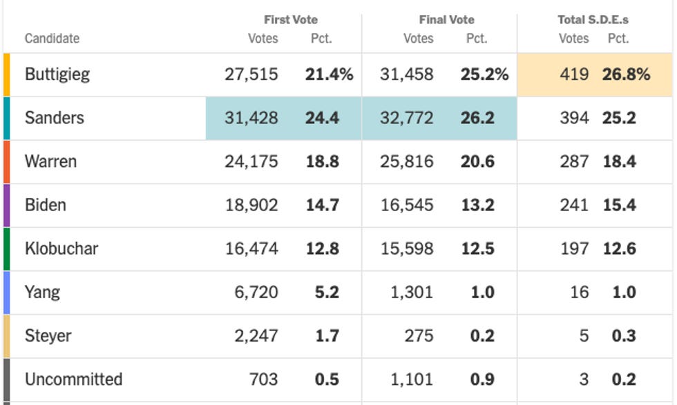 And it's no mystery how this happened. Delegates are allocated based on turnout in the 2016 presidential and 2018 gubernatorial elections, so GOTV in the urban precincts where Sanders is wildly popular translates to limited delegate gain overall. Rural precincts tend to have a greater differential between caucus and general election turnout, so the Iowa Democratic Party puts its thumb on the scale and weights those precincts as if they had a general election turnout for the caucus. Which means that Pete Buttigieg, who campaigned hard in the suburbs and rural areas, is getting a boost from all the phantom-caucus goers the party factors in.