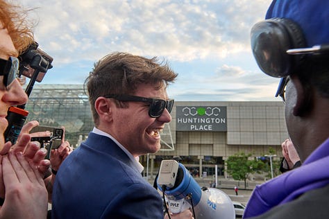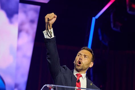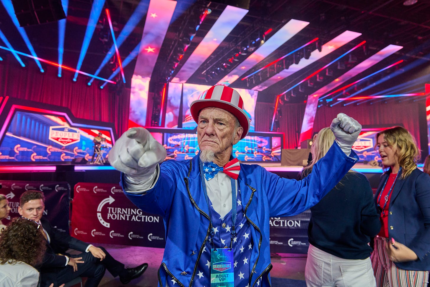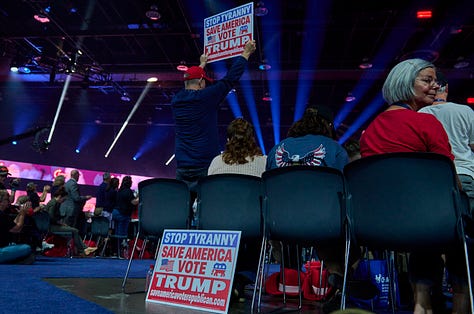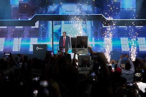 Almost 10 years on, the Trump show is slick, choreographed. When entering, you’re greeted with a smattering of classic pop and rock songs booming, like the Village People. The warm-up act is usually a local loyalist who will talk about how they are personally making America great by starting in your hometown. Then come the cable news staples, like a backbench congressional bomb thrower or some asshole sheriff, to chum the crowd with red meat. Finally comes the MAGA all-star(s) to hurl bombs and buzzwords, and generally keep the crowd entertained in the event Trump is running late (which he often is).