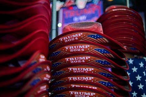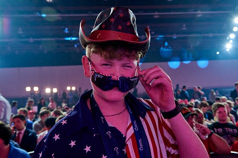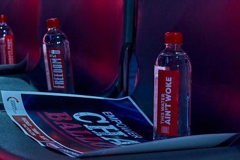 Their rallies are full of in-jokes and memes intended to keep young people engaged. They're sponsored by groups who shill water that isn't "woke," and cellphone plans for patriots. They tell you to buy shirts and hats with slogans and logos rather than organizing GOTV strategies or door knocking. It's not, "vote, vote, vote," it's, "Buy! Buy! Buy!"