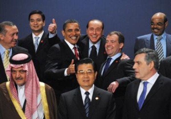 Well this is just a great photo, right? It's the part of a shoot when the photographer tells everyone to "go nuts." For Italy's Silvio Berlusconi this means "molest everyone," while China's Hu Jintao decides to look as boring as possible and the Arab guy gives a shady, mischievous look, just to freak out Americans. There is too much to say about this, so LET'S JUST DO THIS SHIT: BLINGEE CONTEST. RIGHT NOW. TIME. TO. THROW. DOWN. Send submissions (links and/or attachments) to tips@wonkette.com, subject line "I GORDON BROWN'S ANAL POISON," by4: 30 ET (ONE HOUR) 5: 00 ETand we will post some of the best. The prize is an "iPod." [ TNR ]