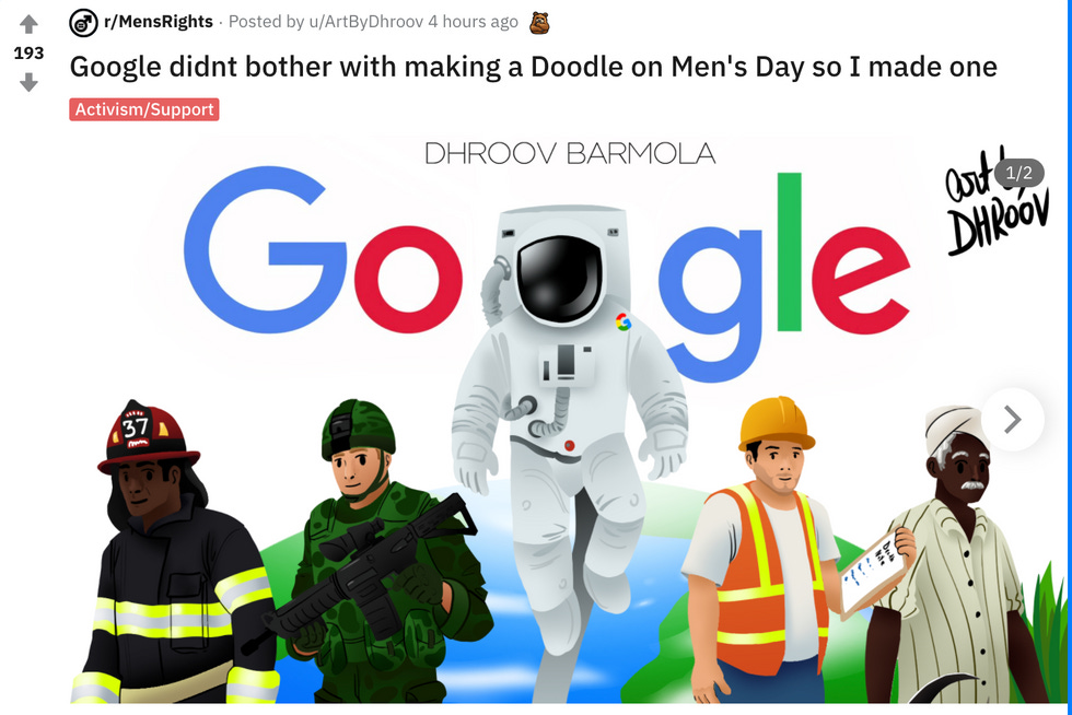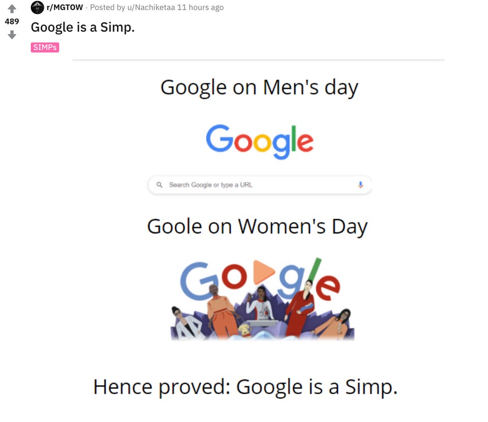 Note that the majority of these come from the MGTOW subreddit. As you may recall, MGTOW stands for "Men Going Their Own Way." So they're going their own way, but they're also really emotionally affected by not being properly celebrated by a Google Doodle.