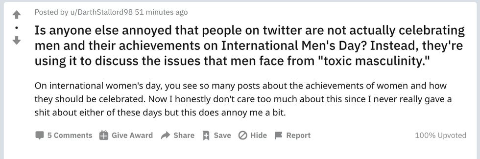 So, it being International Men's Day, I checked back on my old Reddit feed of Angry Garbage Men stuff that I have not looked at since I stopped doing my Garbage Men series because one or two people were super mad about it, which in retrospect does seem a tad overdramatic now that I think about it.
