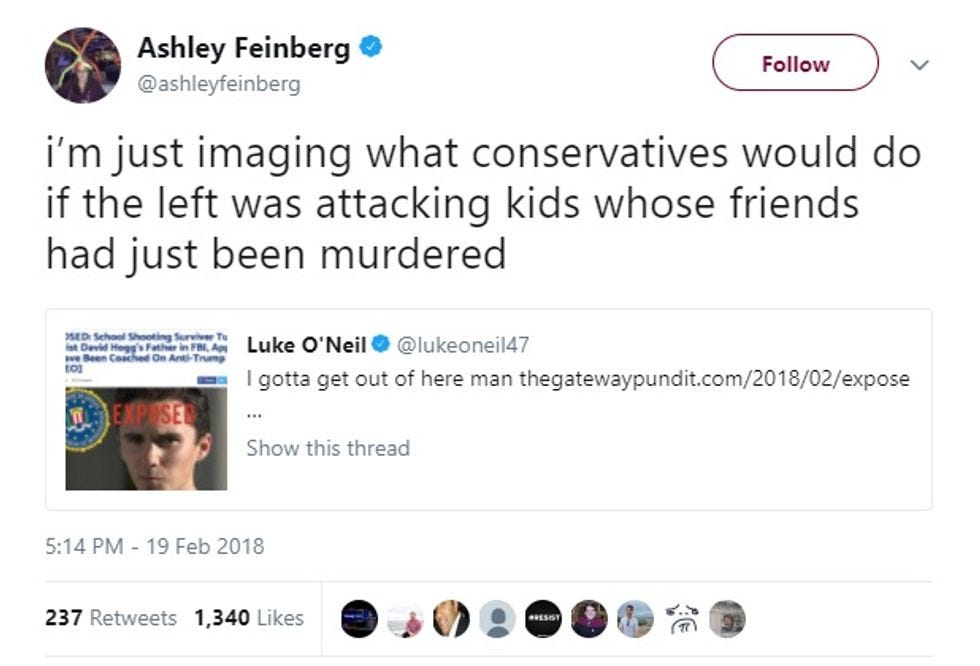 Yep, it sure is disgusting that these kids are turning their grief into an attempt to keep others from dying. Gateway Pundit's attack on grieving teenagers certainly hasn't gone unnoticed on the Twitters, which should get the site some hate-clicks at least. HuffPo's Ashley Feinberg makes the perfectly cromulent observation: