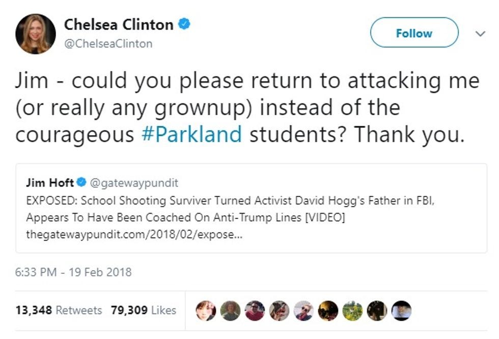 And Chelsea Clinton would like to suggest that maybe Jim Hoft and his merry band of idiots at least stick to picking on adults instead of teenagers, please: