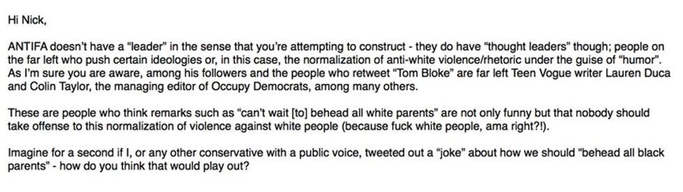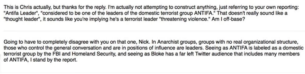 As for Wintrich? We're pretty sure he's taking the piss, but pretending to be super-serious, as an email exchange he Tweeted yesterday suggests. Chris Caesar, a reporter from Mic, asked him whether he really thought "Tom Bloke" was any kind of Antifa leader, or that the tweet was actually calling for violence, so Wintrich replied, duh, the guy's certainly followed by leftists, so obviously he's a thought leaderer.