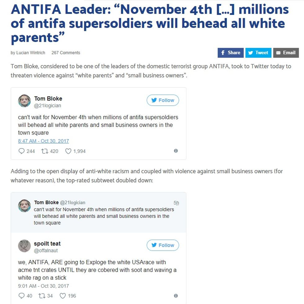 As everyone knows, Antifa is planning a civil war starting either tonight or Saturday (or both!!!), so it stands to reason that the Stupidest Blog on the Internet, Gateway Pundit, is ON IT, with an article by the site's WHITE HOUSE CORRESPONDENT (Jesus), Lucian Wintrich, warning about Antifa's very real plans to murder all the white parents: