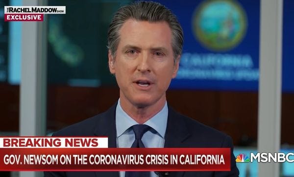 California Gov. Gavin Newsom went on the "Rachel Maddow Show" last night and made some news: His state has joined with a consortium of nonprofits and manufacturers to make sure the state can get its hands on 200 million medical masks a month — mostly the top-quality N95 masks that are needed to protect doctors, nurses, and other medical workers from the novel coronavirus. Here's a guy who's committed to making sure his state — and smaller states, too — have the equipment necessary to get caregivers and patients through the outbreak.