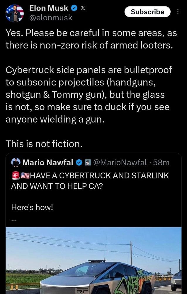 On the other hand, Musk thinks the Cybertrucks are bulletproof in case any looters get any ideas:
