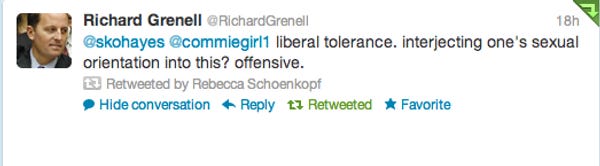 Hey so remember yesterday when Mitt Romney fucked the dog with his response to this mishigas in Libya? Well your Wonket had a thought: what if His Lord High Hairgel had in fact not fired that one dude, Richard Grenell, for being a lover of men? Perhaps Richard Grenell (who people say was super good at his job, maybe?) could have saved him from his ignominious everything, by explaining to him "shut up"? Well, we ran this idea by the Twitter machine, and Richard Grenell himself responded! (Above. It is right there.)