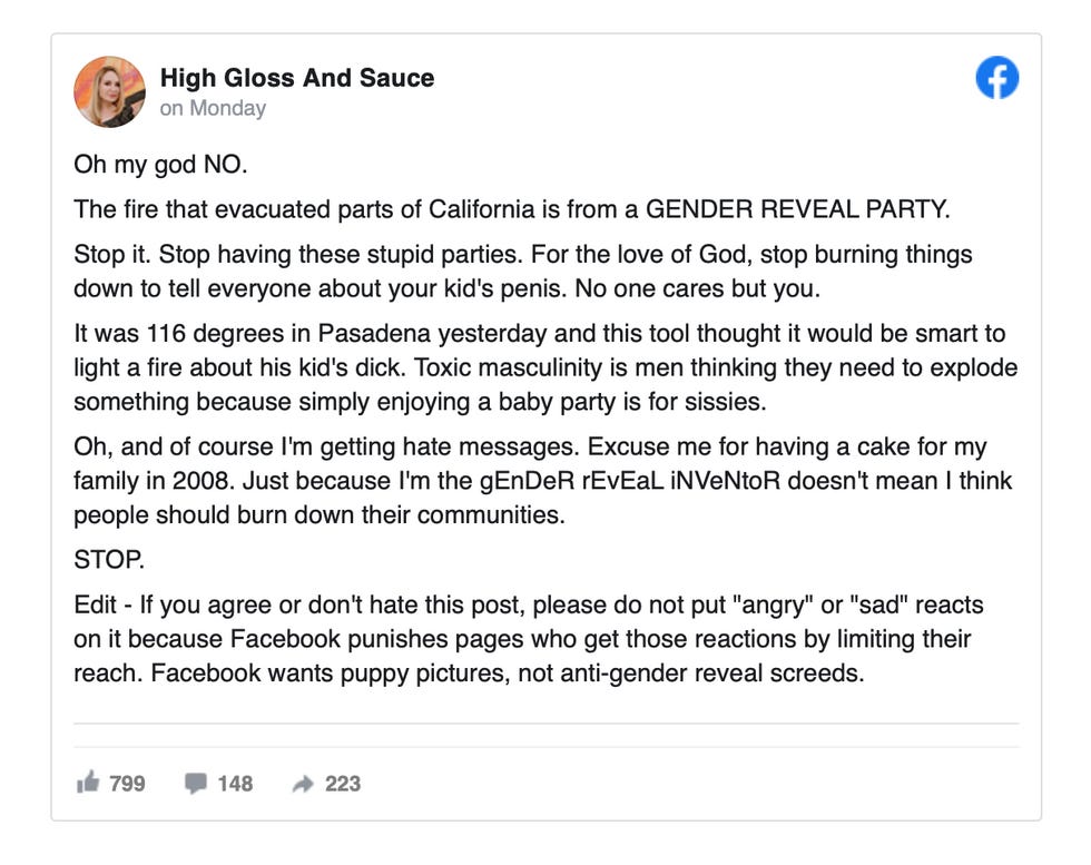 Saturday's catastrophe led to an interesting Facebook post denouncing the entire gender-reveal racket.