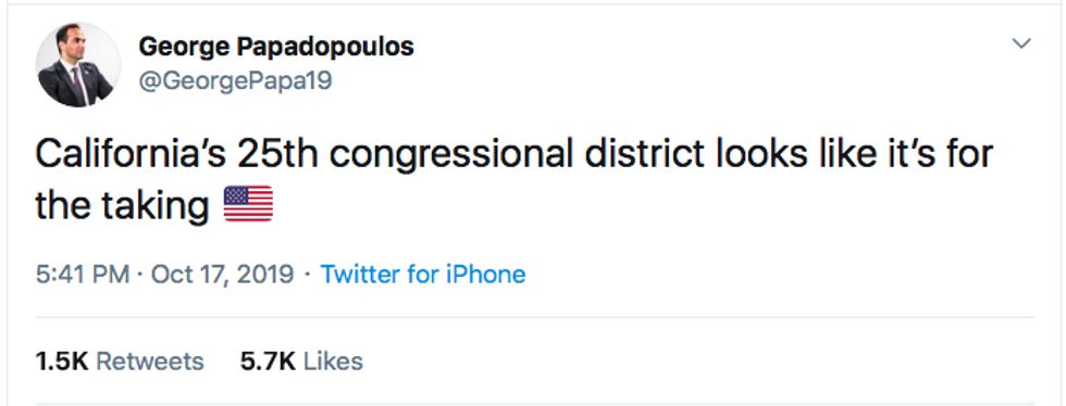 What's interesting is the timing of the tweet where Papadopoulos declared that Hill's district was ripe "for the taking." It's from October 17, the day before RedState released its "bisexuals and bongs" expose on Hill. A year before the next election, there was no compelling reason to consider the 25th vulnerable. It's been trending blue for years now, and even when Trump was on the ballot, Hillary Clinton won the district by 7 points. This reads like confidence fueled by revenge porn. You know, allegedly.