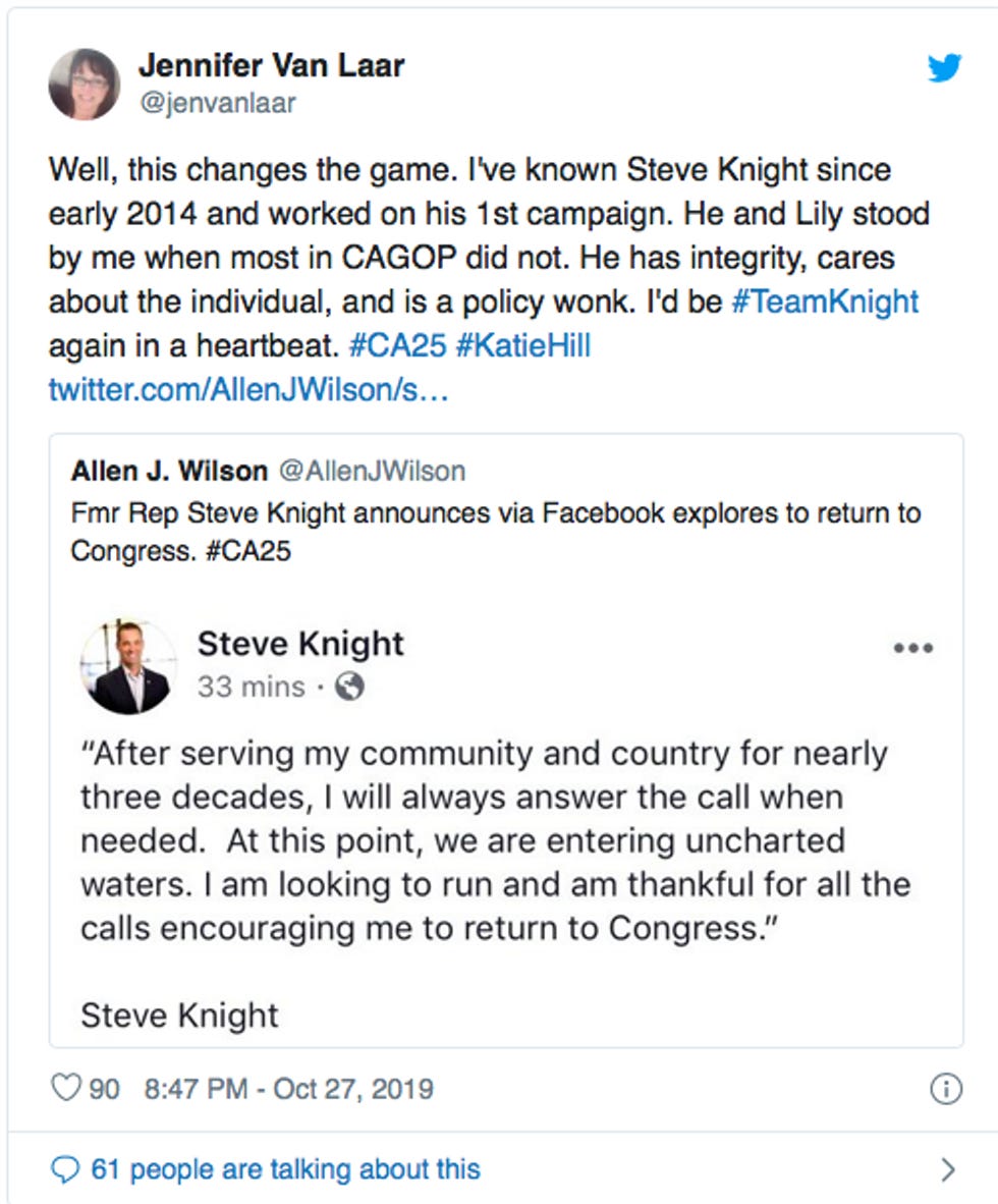 Katie Hill has resigned from Congress after a calculated and vicious smear campaign. Republicans are hoping to reclaim her seat representing California's 25th congressional district, and (more or less) serious contenders have wasted no time launching campaigns. There's Mike Garcia , who was a vocal Hill critic, and Angela Underwood-Jacob, who breakdanced on Hill's political grave before it was even dug. Former Rep. Steve Knight, who Hill defeated last year, is considering running again. One man's revenge porn is another man's career opportunity.