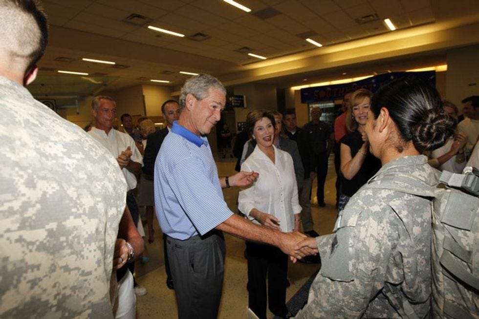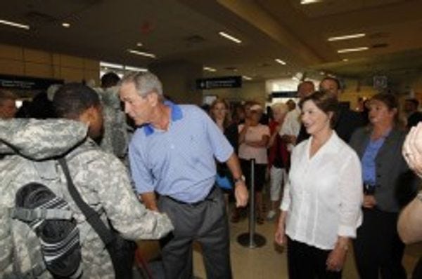 We are fairly certain that George W. Bush is currently touching stuff in Haiti, but new photos have surfaced that suggest maybe he is also still in Texas shaking hands with troops returning from war, via CNN Hologram. Isn't it special that George Bush is willing to touch other people, even though he hates it so much?