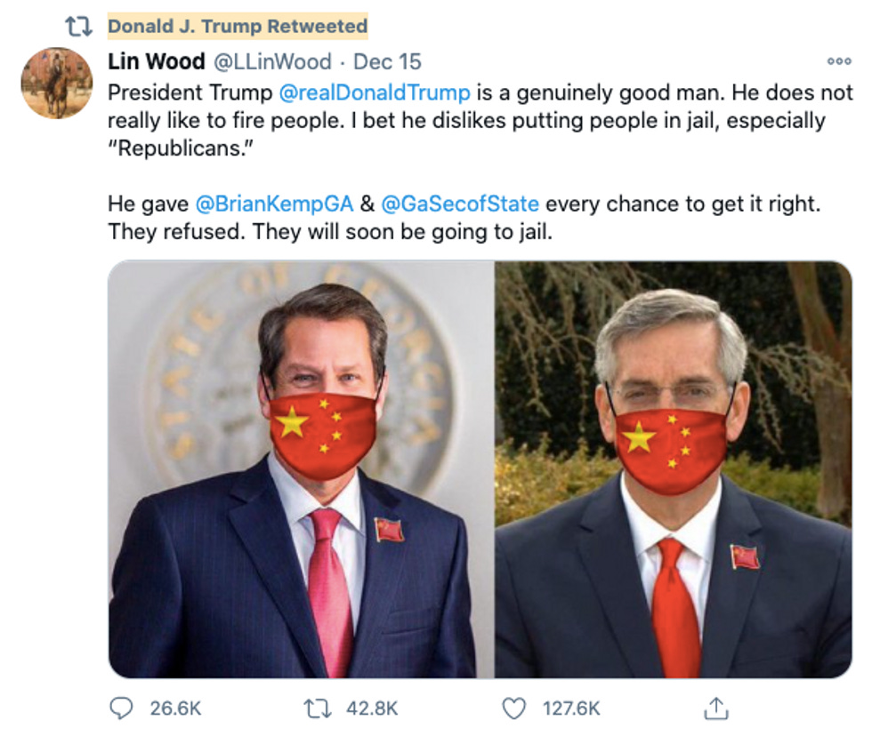 Raffensperger went on to praise his office's election management, noting that Georgia was "the first state in the country to implement the trifecta of automatic voter registration, at least 16 days of early voting (which has been called the 'gold standard'), and no-excuse absentee voting." Which will no doubt impress the president, who yesterday retweeted lunatic Georgia lawyer Lin Wood's call for Kemp and Raffensperger to be arrested.