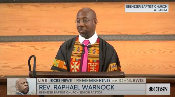 Warnock is senior pastor of the Ebenezer Baptist Church in Atlanta. He presided over the late Rep. John Lewis's funeral. He's also a native of Savannah, Georgia, one of the greatest cities on Earth, so that should settle the whole thing, but I guess we still have to have an election.