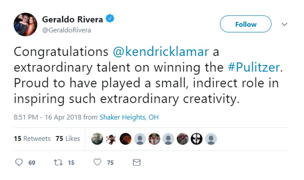 WTF? That is what you may be asking right now! How on earth did Geraldo inspire Kendrick Lamar's extraordinary creativity in a small, indirect way, which led to Lamar winning the Pulitzer Prize in music for his record DAMN. ? What did Geraldo do that in a still, small way helped Kendrick Lamar be not only the first hip-hop artist, but also the first non-classical or jazz artist, to win a Pulitzer in music?