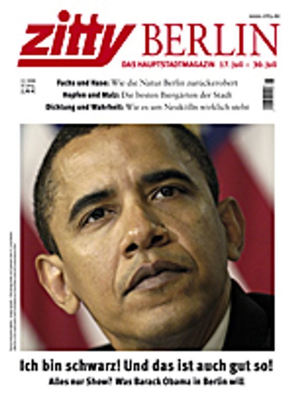 Here is your Barack Obama on the cover of a German magazine calledzitty, which according to Wonkette German Translation Operative Mia is "Berlin's version of Time Out." She writes, "The headline translates roughly to, 'I am Black! And that's great.' It's a word play on the coming-out speech of Berlin's gay mayor." The article begins with a Morrissey quote, in order to make Barack Obama seem even gayer. [ zitty Berlin ]