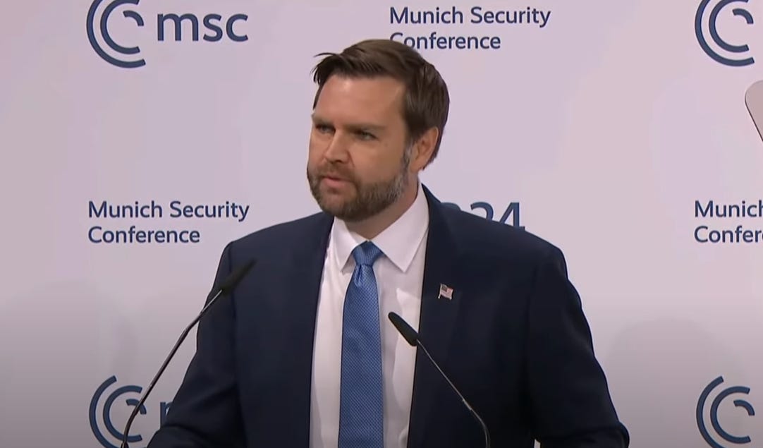 What a great first overseas trip for American Reichsleiter — excuse us, American Vice President — JD Vance, the feral ignoramus the American people in their wisdom have chosen to put one 78-year-old heartbeat away from the world’s most powerful office. Well, second-most, next to whatever office Elon Musk occupies in the White House.